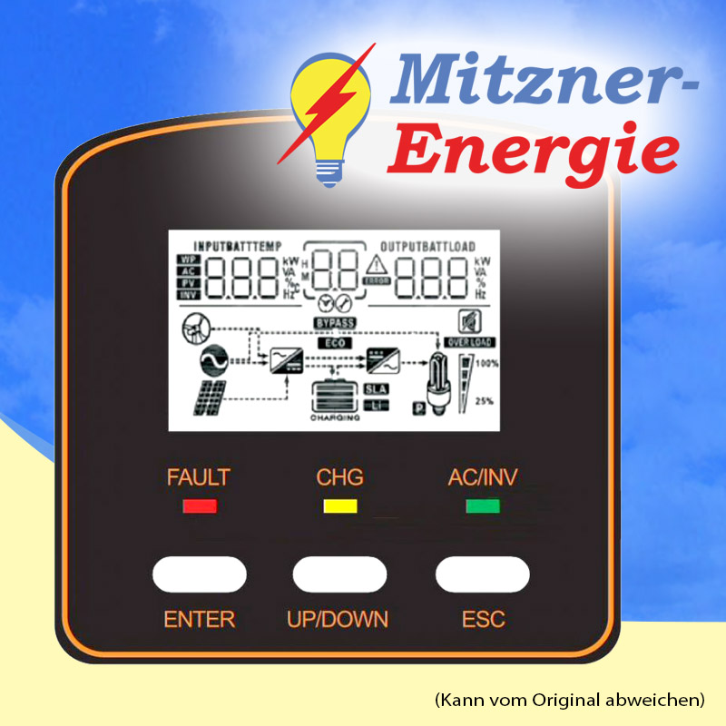 Das integrierte hochauflösende LCD-Display dient zur Steuerung, Einstellung und Darstellung aller Menü- und Konfigurationpunkte. Alle Daten und Werte können direkt am Gerät eingestellt und abgelesen werden. Übersichtliche Grafiken und Symbole zeigen alle Funktionen und ermöglichen eine einfache Bedienung des Wechselrichters. Die einfache Drei-Punkt-Steuerung macht das Auswählen und Steuern im Menü kinderleicht. - Batterieschutz Unterspannung